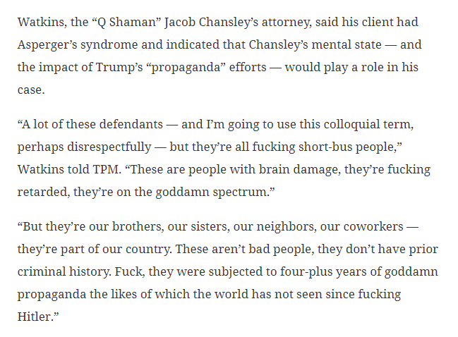 Quote: @greediron said:That would be The Shamans own attorney, Albert Watkins It’s the tactic for the defense, check out the whole interview, that will realy get you chafed. :p