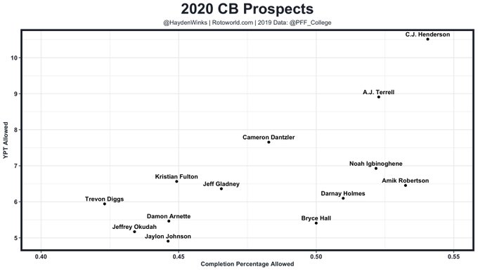 Here's how the 2020 CB prospects performed in coverage last year per @PFF. CBs in the bottom left did the best. It's worth noting that C.J. Henderson was much better in 2018 (50% completions, 6.9 YPT).
